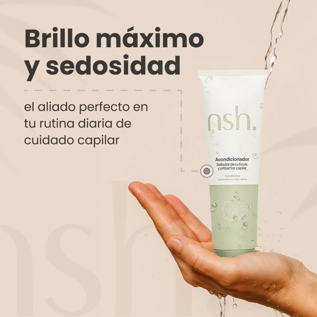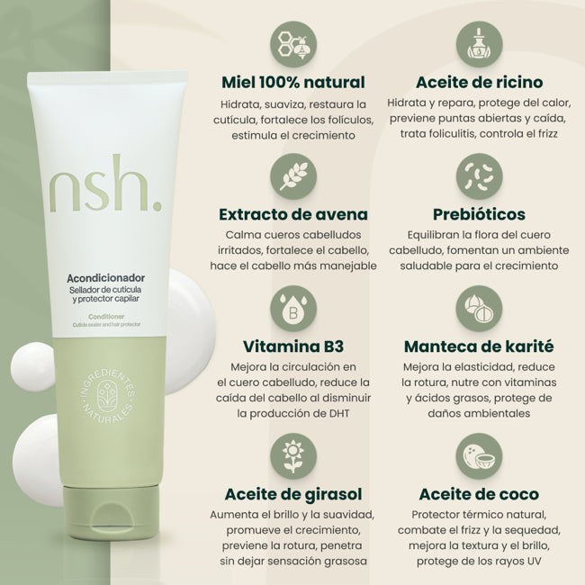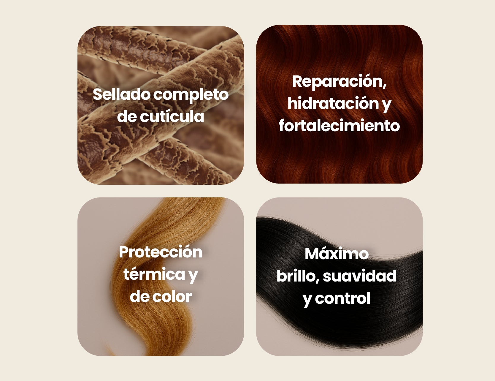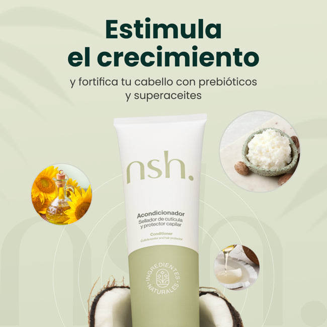 Nuestro acondicionador de 300 mL está formulado con prebióticos y súper aceites que nutren intensamente, reparan el cabello severamente maltratado y equilibran el microbioma del cuero cabelludo, promoviendo un crecimiento saludable. No solo repara y nutre profundamente: también sella la cutícula y forma una barrera protectora que previene la rotura y el daño diario.